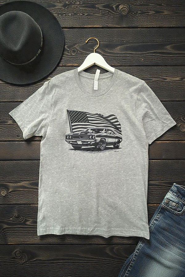 This shirt is made with a DTF (direct to Film) transfer that are more vibrant in color. The hand feel is between a plastisol transfer (our usual designs) and a vinyl transfer.*** Basic Short sleeve graphic tee with a crew neck BC AMERICAN CAR