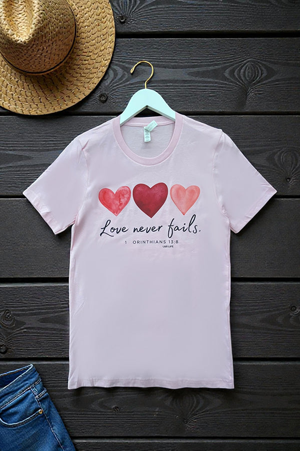 This shirt is made with a DTF (direct to Film) transfer that are more vibrant in color. The hand feel is between a plastisol transfer (our usual designs) and a vinyl transfer.*** Basic Short sleeve graphic tee with a crew neck BC DTF LOVE NEVER FAILS