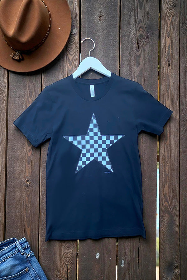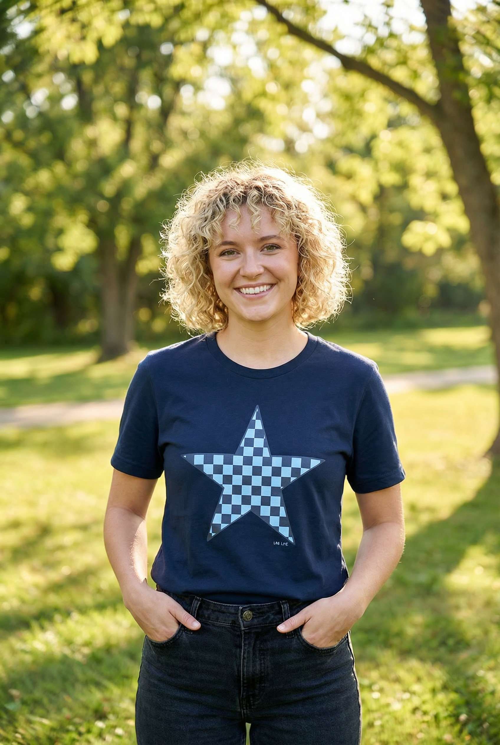This shirt is made with a DTF (direct to Film) transfer that are more vibrant in color. The hand feel is between a plastisol transfer (our usual designs) and a vinyl transfer.*** Basic Short sleeve graphic tee with a crew neck BC DTF CHECKER STAR