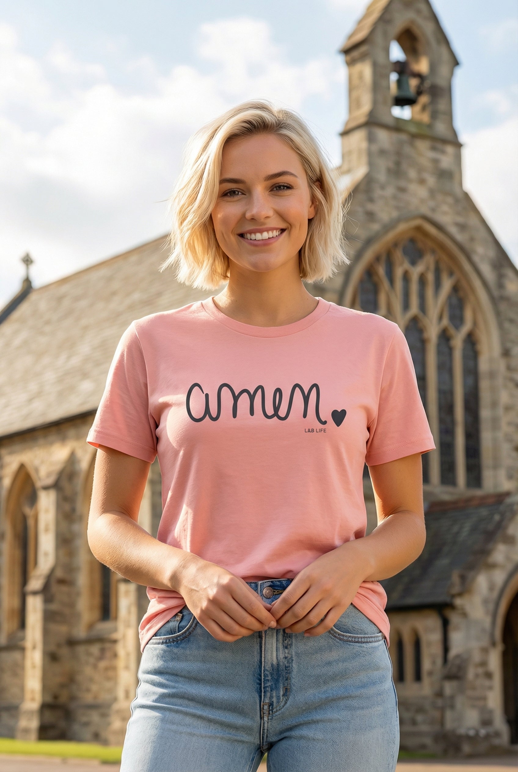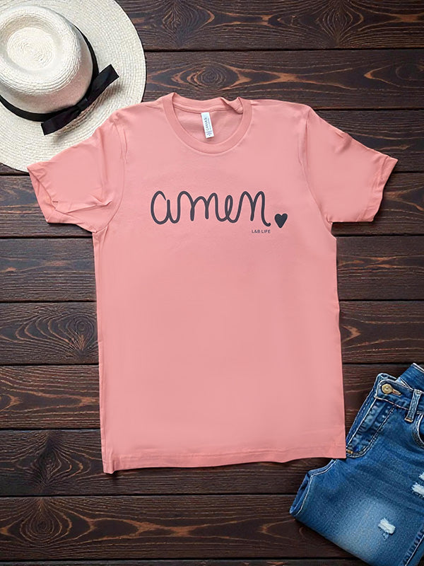 This shirt is made with a DTF (direct to Film) transfer that are more vibrant in color. The hand feel is between a plastisol transfer (our usual designs) and a vinyl transfer.*** Basic Short sleeve graphic tee with a crew neck BC DTF AMEN
