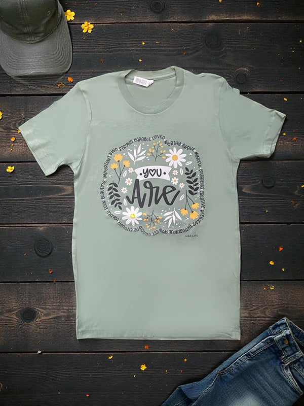 This shirt is made with a DTF (direct to Film) transfer that are more vibrant in color. The hand feel is between a plastisol transfer (our usual designs) and a vinyl transfer.*** Basic Short sleeve graphic tee with a crew neck BC DTF YOU ARE