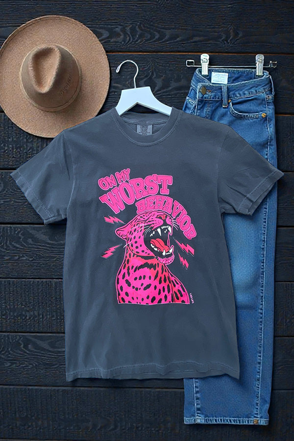 This shirt is made with a DTF (direct to Film) transfer that are more vibrant in color. The hand feel is between a plastisol transfer (our usual designs) and a vinyl transfer.*** Basic Short sleeve graphic tee with a crew neck CC DTF WORST BEHAVIOR