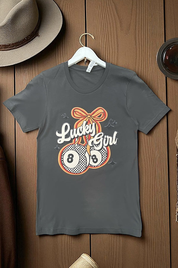 This shirt is made with a DTF (direct to Film) transfer that are more vibrant in color. The hand feel is between a plastisol transfer (our usual designs) and a vinyl transfer.*** Basic Short sleeve graphic tee with a crew neck BC DTF LUCKY GIRL