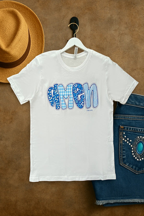 This shirt is made with a DTF (direct to Film) transfer that are more vibrant in color. The hand feel is between a plastisol transfer (our usual designs) and a vinyl transfer.*** Basic Short sleeve graphic tee with a crew neck BC DTF BLU AMEN
