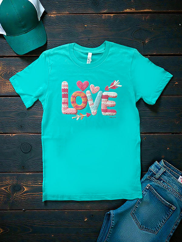 This shirt is made with a DTF (direct to Film) transfer that are more vibrant in color. The hand feel is between a plastisol transfer (our usual designs) and a vinyl transfer.*** Basic Short sleeve graphic tee with a crew neck BC DTF LOVE YARN