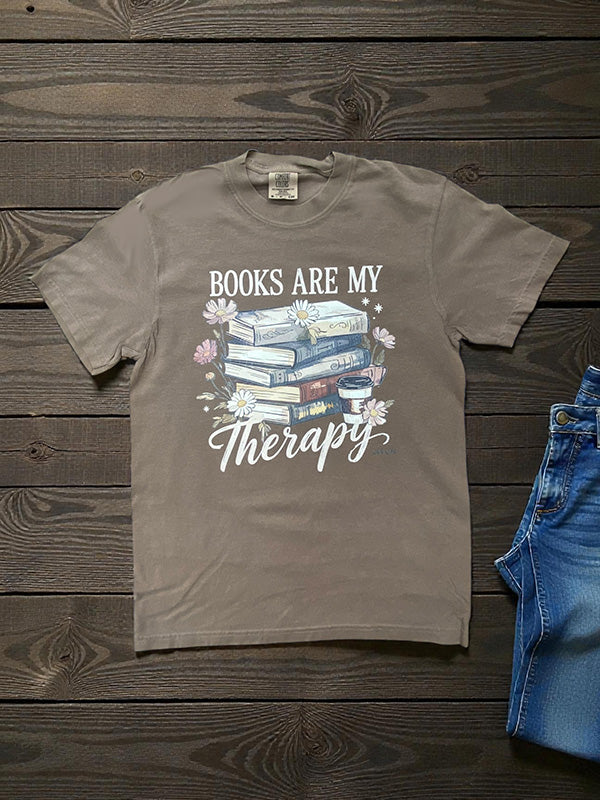 This shirt is made with a DTF (direct to Film) transfer that are more vibrant in color. The hand feel is between a plastisol transfer (our usual designs) and a vinyl transfer.*** Basic Short sleeve graphic tee with a crew neck CC DTF BOOKS ARE MY THERPY