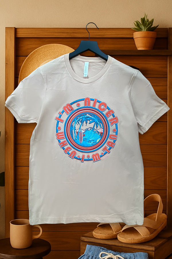 This shirt is made with a DTF (direct to Film) transfer that are more vibrant in color. The hand feel is between a plastisol transfer (our usual designs) and a vinyl transfer.*** Basic Short sleeve graphic tee with a crew neck BC DTF I'M NICER WHEN TANNED
