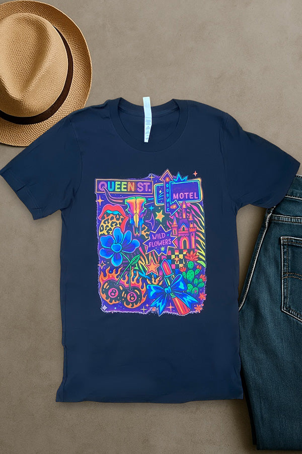 This shirt is made with a DTF (direct to Film) transfer that are more vibrant in color. The hand feel is between a plastisol transfer (our usual designs) and a vinyl transfer.*** Basic Short sleeve graphic tee with a crew neck BC DTF QUEEN ST