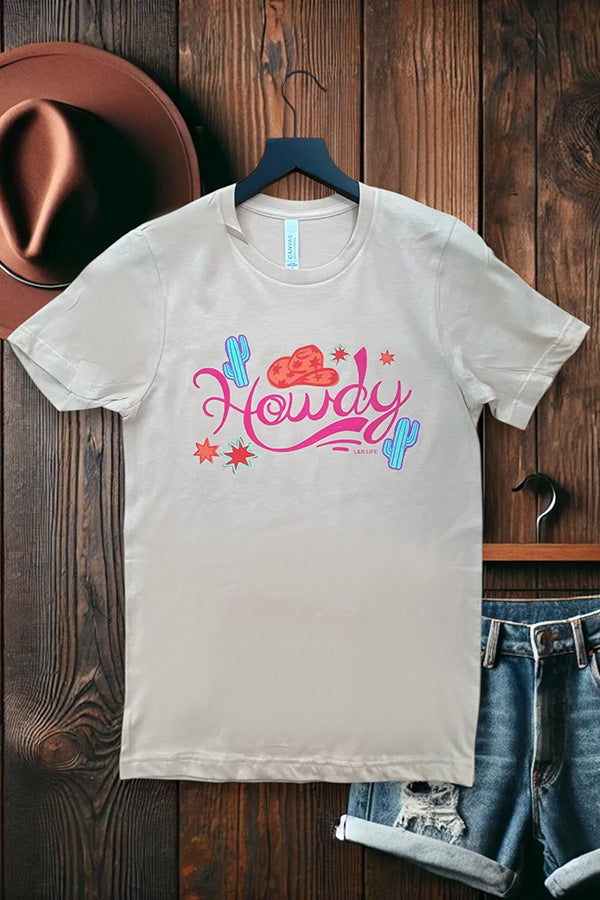 This shirt is made with a DTF (direct to Film) transfer that are more vibrant in color. The hand feel is between a plastisol transfer (our usual designs) and a vinyl transfer.*** Basic Short sleeve graphic tee with a crew neck BC DTF STAR HOWDY