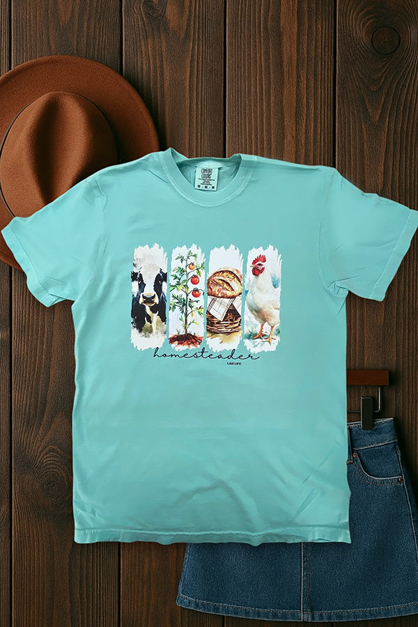 This shirt is made with a DTF (direct to Film) transfer that are more vibrant in color. The hand feel is between a plastisol transfer (our usual designs) and a vinyl transfer.*** Basic Short sleeve graphic tee with a crew neck CC DTF HOMESTAEDER