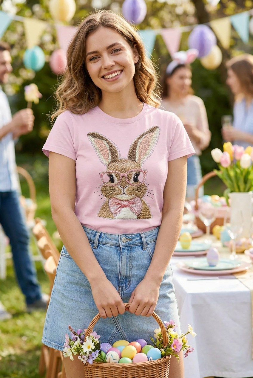 This shirt is made with a DTF (direct to Film) transfer that are more vibrant in color. The hand feel is between a plastisol transfer (our usual designs) and a vinyl transfer.*** Basic Short sleeve graphic tee with a crew neck BC DTF BUNNY GLASSES