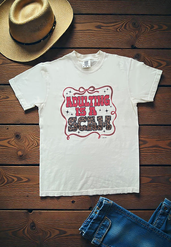 This shirt is made with a DTF (direct to Film) transfer that are more vibrant in color. The hand feel is between a plastisol transfer (our usual designs) and a vinyl transfer.*** Basic Short sleeve graphic tee with a crew neck CC DTF ADULTING IS A SCAM