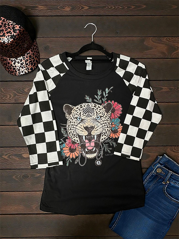 This shirt is made with a DTF (direct to Film) transfer that are more vibrant in color. The hand feel is between a plastisol transfer (our usual designs) and a vinyl transfer.*** Basic Short sleeve graphic tee with a crew neck LS CHECKER LEOPARD