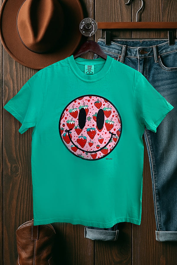 This shirt is made with a DTF (direct to Film) transfer that are more vibrant in color. The hand feel is between a plastisol transfer (our usual designs) and a vinyl transfer.*** Basic Short sleeve graphic tee with a crew neck CC DTF STRAWBERRY FACE
