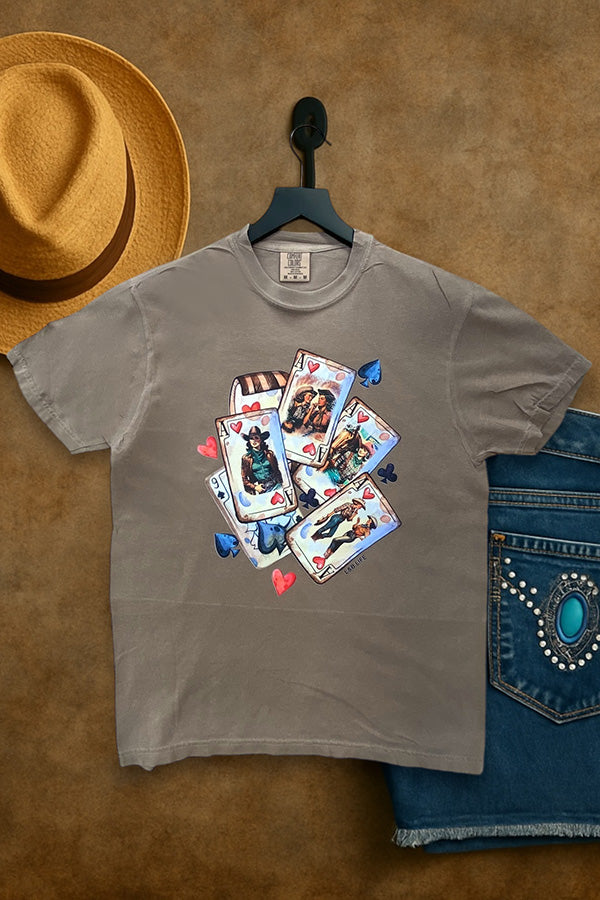 This shirt is made with a DTF (direct to Film) transfer that are more vibrant in color. The hand feel is between a plastisol transfer (our usual designs) and a vinyl transfer.*** Basic Short sleeve graphic tee with a crew neck CC DTF ACE CARDS CG