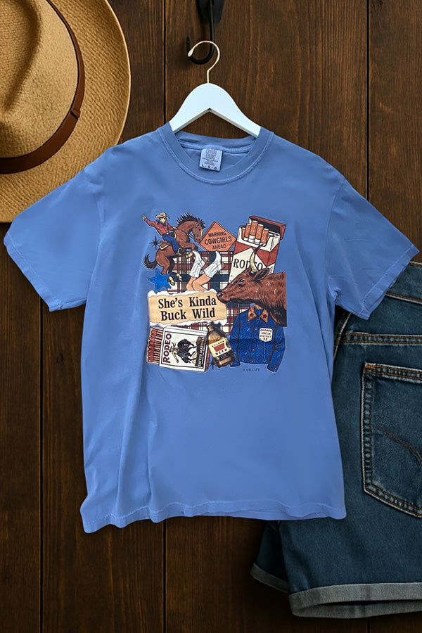 This shirt is made with a DTF (direct to Film) transfer that are more vibrant in color. The hand feel is between a plastisol transfer (our usual designs) and a vinyl transfer.*** Basic Short sleeve graphic tee with a crew neck CC DTF SHE KIND OF BUCK WILD