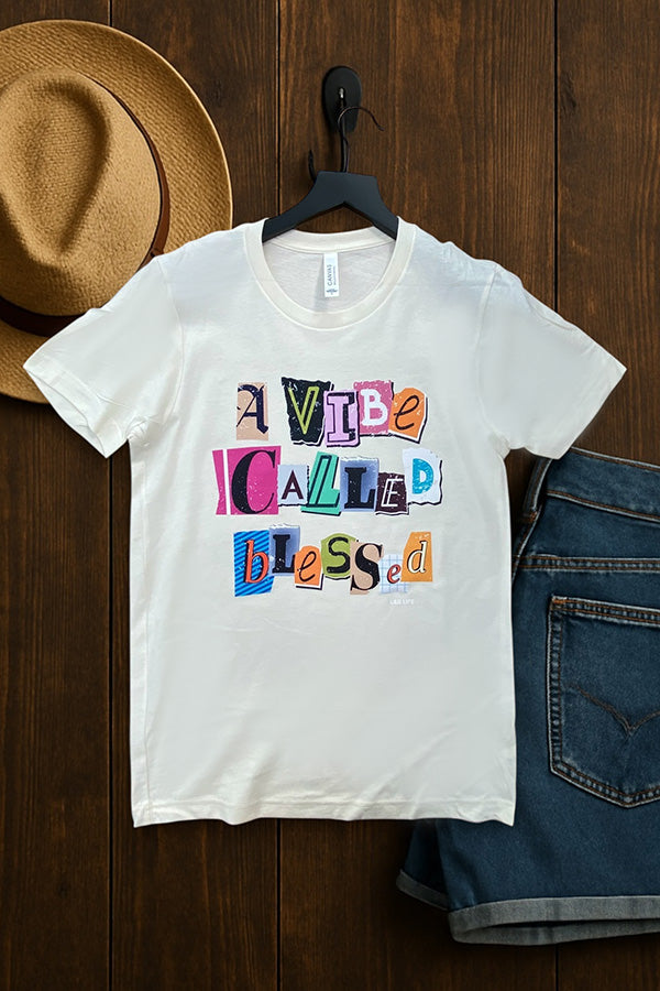 This shirt is made with a DTF (direct to Film) transfer that are more vibrant in color. The hand feel is between a plastisol transfer (our usual designs) and a vinyl transfer.*** Basic Short sleeve graphic tee with a crew neck BC DTF A VIBE CALLED BLESSED