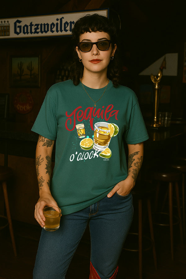 This shirt is made with a DTF (direct to Film) transfer that are more vibrant in color. The hand feel is between a plastisol transfer (our usual designs) and a vinyl transfer.*** Basic Short sleeve graphic tee with a crew neck BC DTF TEQUILA O CLOCK