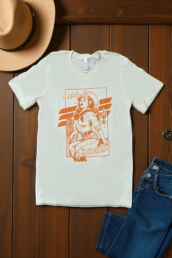 This shirt is made with a DTF (direct to Film) transfer that are more vibrant in color. The hand feel is between a plastisol transfer (our usual designs) and a vinyl transfer.*** Basic Short sleeve graphic tee with a crew neck BC DTF SADDLE UP SWEETHEART