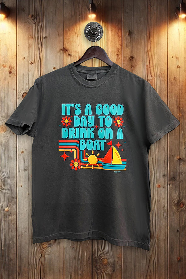 This shirt is made with a DTF (direct to Film) transfer that are more vibrant in color. The hand feel is between a plastisol transfer (our usual designs) and a vinyl transfer.*** Basic Short sleeve graphic tee with a crew neck CC DTF ITS A GOOD DAY TO DRINK ON A BOAT