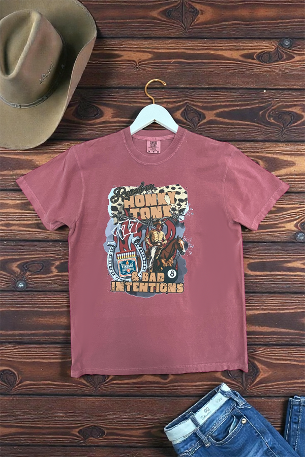 This shirt is made with a DTF (direct to Film) transfer that are more vibrant in color. The hand feel is between a plastisol transfer (our usual designs) and a vinyl transfer.*** Basic Short sleeve graphic tee with a crew neck CC DTF HONKY TONK TEE